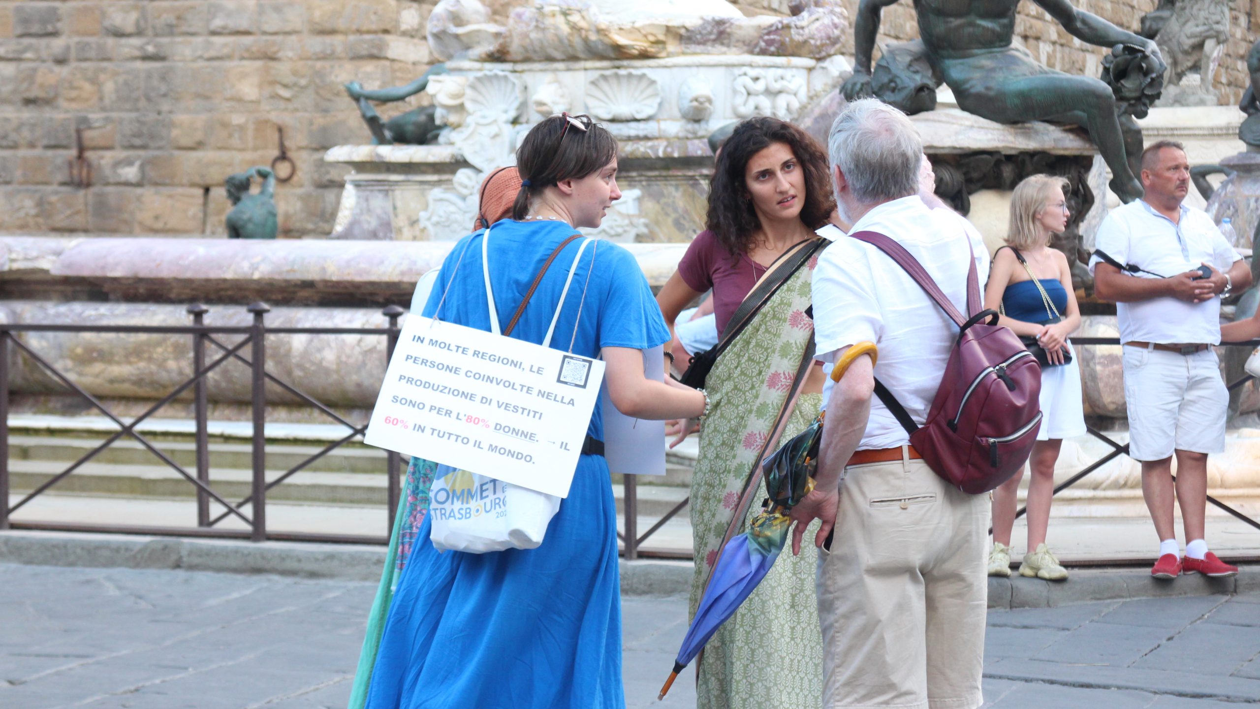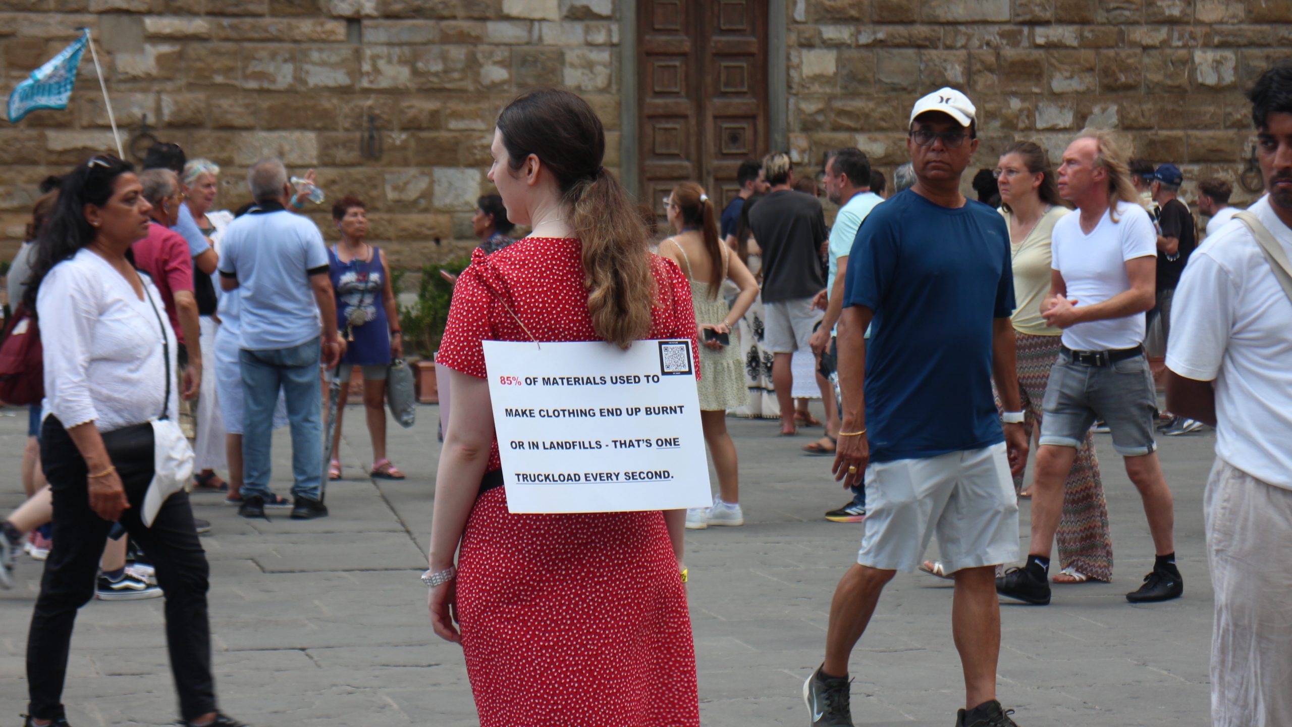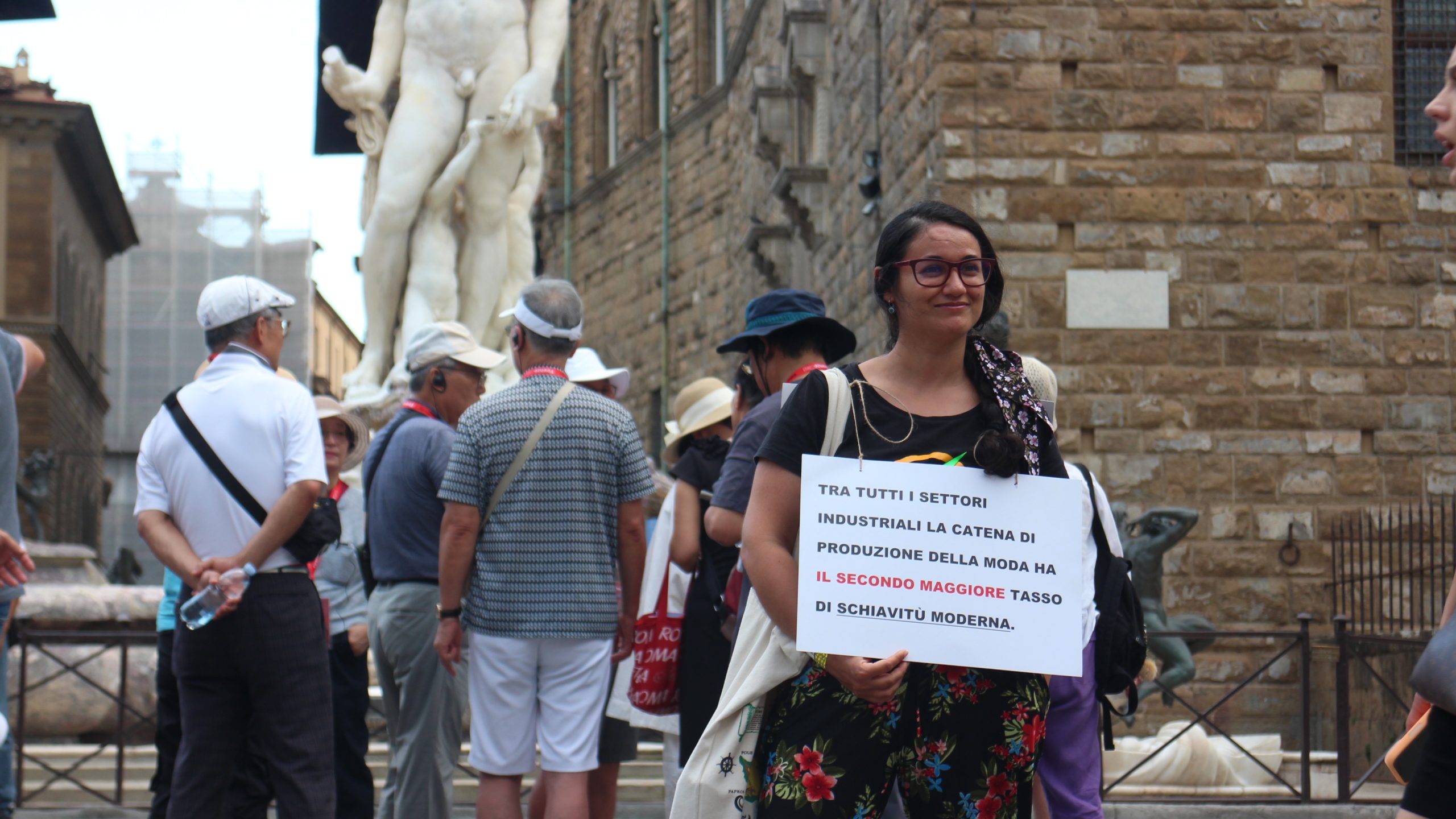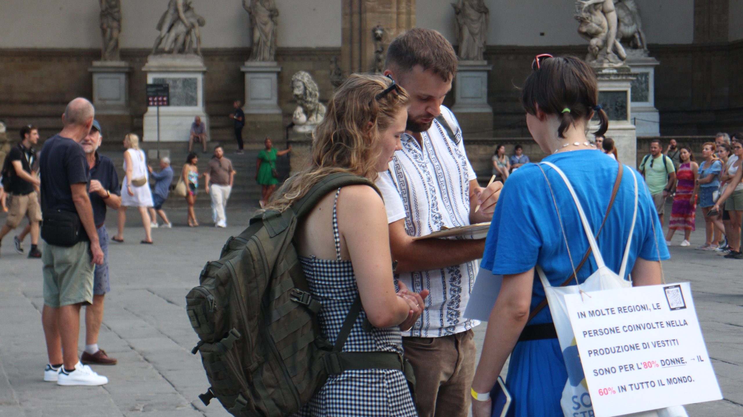 In Florence we met a lot of tourists and some Italians. Some of them were very aware about the fast fashion issues, very supportive. Some others finding the topic uninteresting or refused the sign because they are addicted to fast-fashion. We even met 2 men (surprisingly) who were against our proposal because “we will finish naked without fast fashion”.